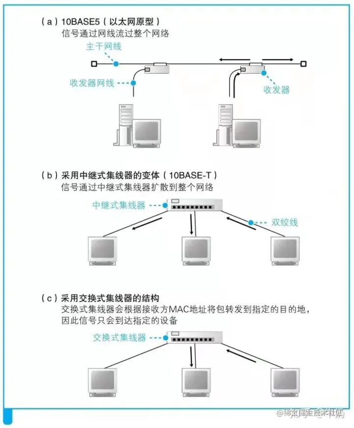 扯远了,不过先要知道,集线器和交换机最初设计的目的是:将载有信息的网络包尽可能原样的转发到目的地。 真正以太网最初的原型如下图(a)。通过一个主干线将所有的计算机连接起来,每个计算器通过收发器来接收和发送消息到主干线上。它最主要的特点就在于,任何一台计算机发送信息到主干线后,所有的计算机都能够接收到(这一点很重要在后续会经常提到) 。不过这个形态有个缺点是,一旦主干线出现问题,所有计算机的通信便被中断无法进行。所以后来演变为图(b)的形态。它将主干线换成了中继式集线器,将收发器网线替换成了双绞线,其中中继式集线器就是我们常说的集线器。不过,虽然网络的结构发生了变化,但集线器依然保留着原有的特性,即一台计算机发送的信息会被所有的计算机设备接收。而一直到图(c),交换式集线器(也就是我们常说的交换机)的出现,才改变了信号发送给所有设备这一性质,能够实现将信号发送到特定设备中。具体是怎么实现特定发送的呢?后续再说,我们先看集线器。