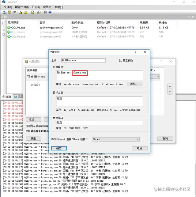 这时候Proxifer打开的时候浏览器会链接不了网络,可以通过设置Fiddler方式,连接网络,添加谷歌浏览器执行程序文件,确认后,可以上网