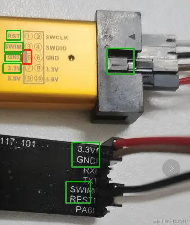我们按照烧录器上的丝印RST SWIM GND 3.3V 和我们的目标板连接即可。
