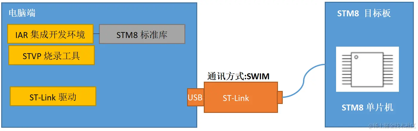 STM8单片机开发环境的由3部分组成:电脑端开发环境、目标板、烧录仿真器。