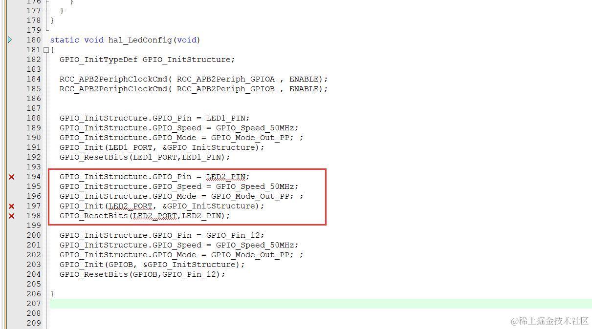 当然,STM32的引脚配置,你也要增加一个GPIO来控制LED2。