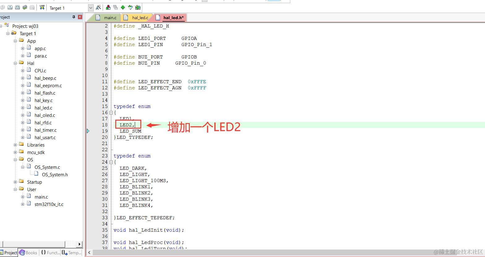 比如说,原来我的产品只有一个LED1,现在要新增加一个LED2,那你只需要在头文件LED枚举定义增加一个LED2: