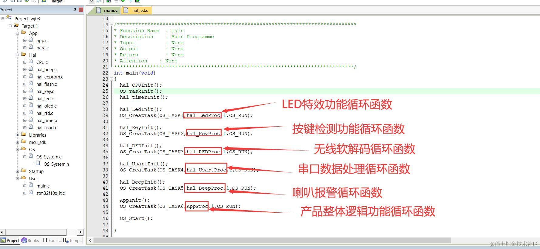 我们加入了一个自己写的小系统在里面,所有功能函数通过模拟任务管理的形式去执行,虽然最终也是在while(1)死循环里。
