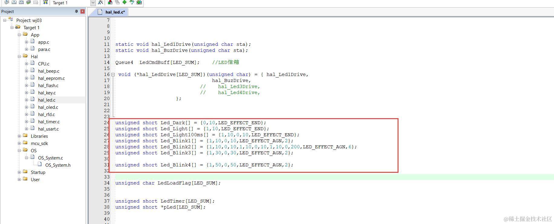 就像我写的LED特效的程序,原理就是通过数组存储不同时间段引脚的状态,然后配合定时器把这个波形(PWM)在引脚里展现出来,实现不同LED特效的功能。