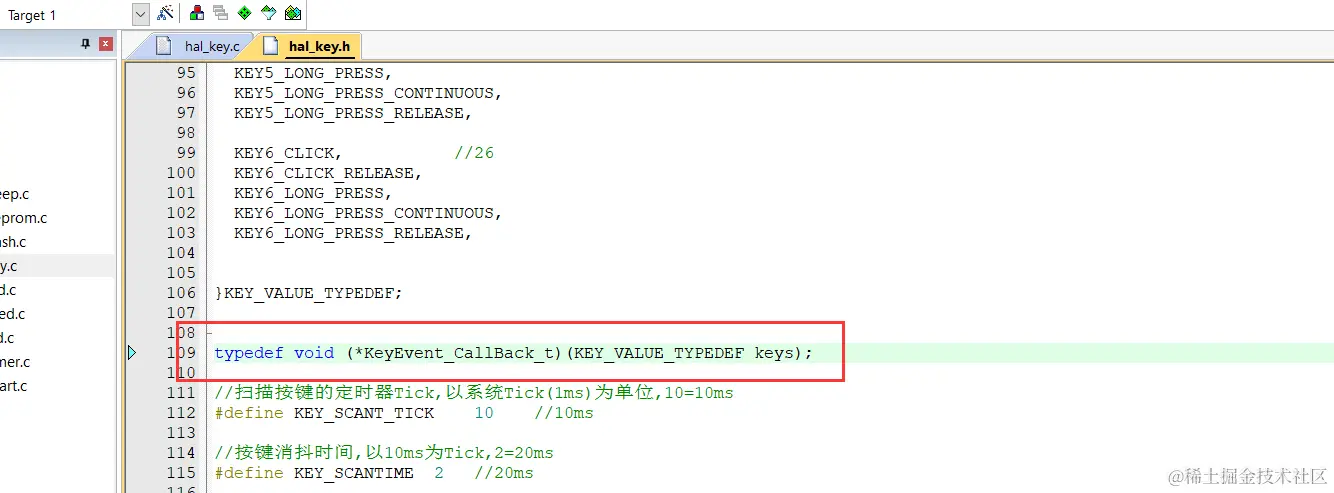 自定义了函数指针类型以后,我们就可以通过KeyEvent_CallBack_t这个类型名称,去定义我们的函数指针变量。