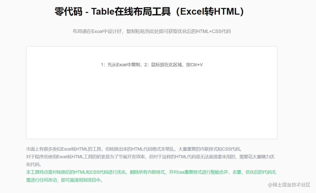 市面上有很多类似Excel转HTML的工具,但转换出来的HTML代码格式非常乱,大量重复的内联样式和CSS代码。对于程序员使用Excel转HTML工具的初衷是为了节省开发效率,但对于这样的HTML代码是无法直接拿来用的,需要花大量精力优化代码。