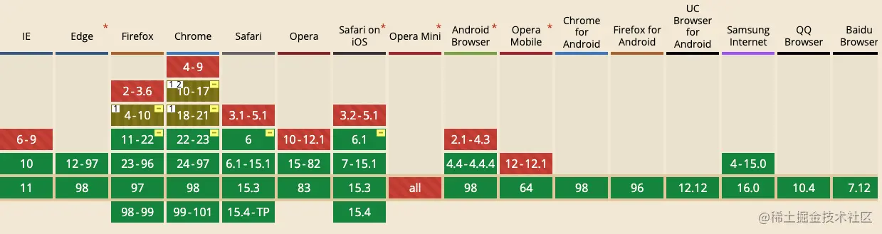requestAnimationFrame实现动画相比定时器或者延时器的优势在于能利用显示器的屏幕刷新频率,改善视觉效果减少卡顿。并且当页面未激活时(切后台)动画会停止。浏览器基本都支持该属性(图片来自 can i use),低版本可以使用延时器进行兼容。