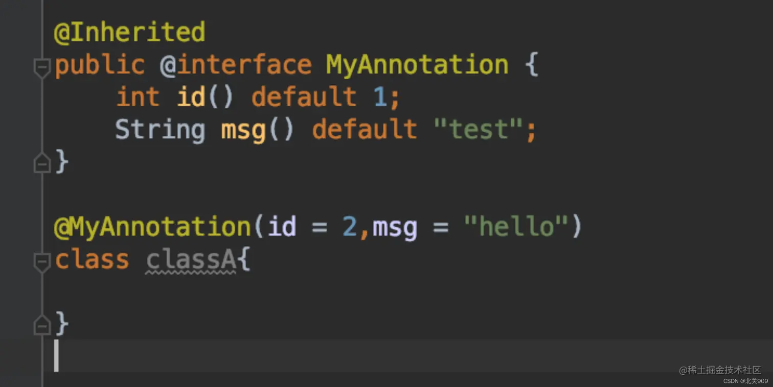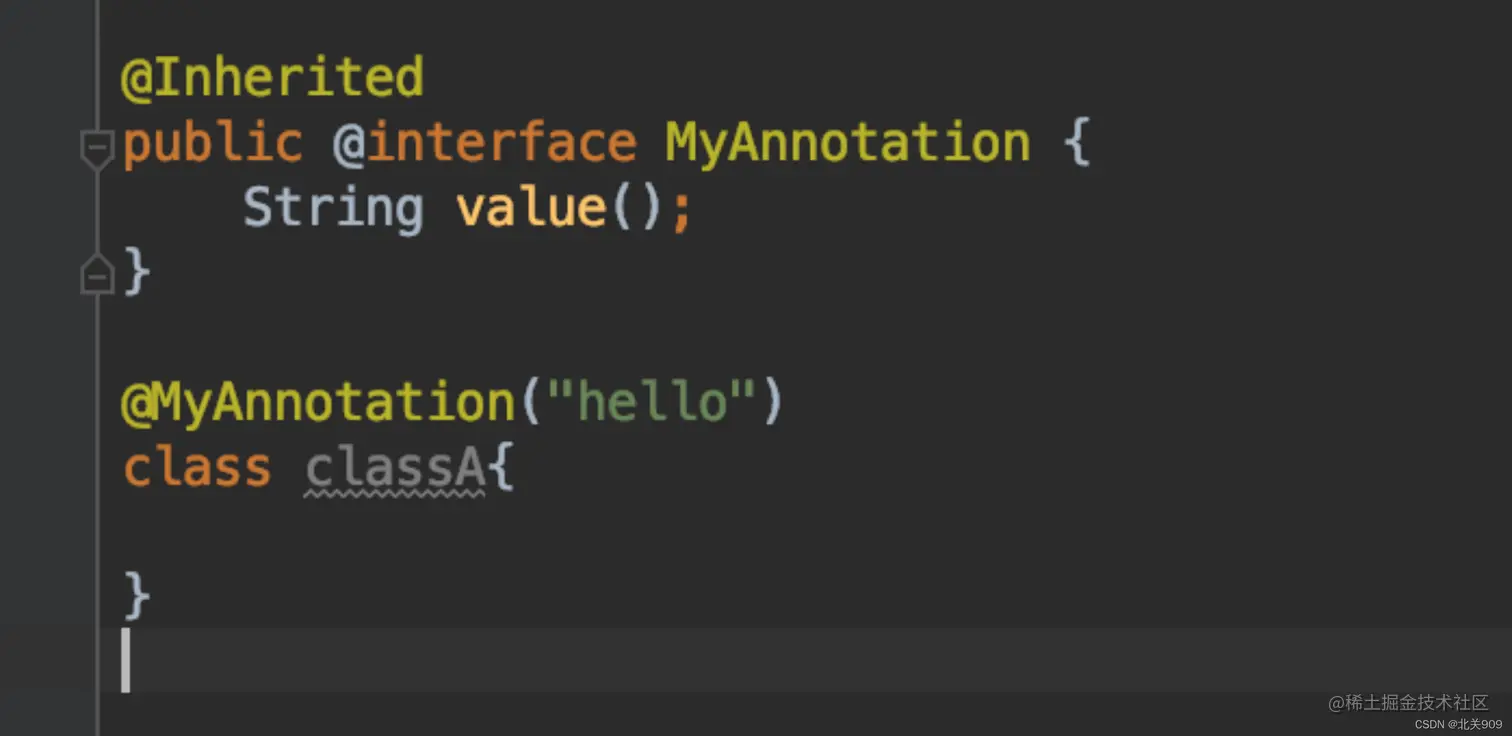 注解@MyAnnotation 被@Inherited标记,所以当classA 被注解@MyAnnotation标记,classB继承classA时,classB默认也拥有@MyAnnotation注解。