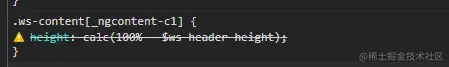 记录cacl()函数中使用变量不生效的问题 漫天莹火 2022-02-23 138 阅读1分钟 问题 使用cacl()动态计算元素的高度,运算中包含一个scss变量。如下: height: calc(100% - $ws-header-height); 在浏览器中发现并没有达到预期效果,scss变量没有被解析。如下: 解决 使用scss 的插值语句 #{} height: calc(100% - #{$ws-header-height}); 就在浏览器中正常解析了