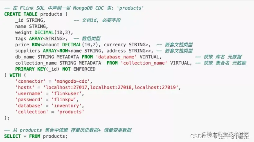 使用 MongoDB CDC 连接器,用户只需要声明如下 Flink SQL 就能实时捕获 MongoDB 数据库中的全量和增量变更数据,借助 Flink 强大的集成能力,用户可以非常方便地将 MongoDB 中的数据实时同步到 Flink 支持的所有下游存储。