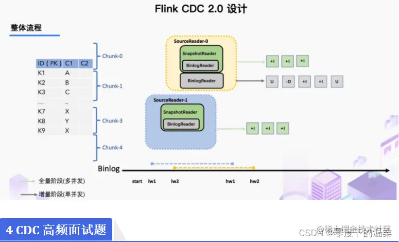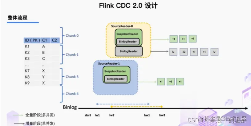 (1)在快照阶段,根据表的主键和表行的大小将 快照(Snapshot) 切割成多个 快照块(Snapshot Chunk) ,然后将 快照块 被分配给多个 快照读取器(SourceReader)。