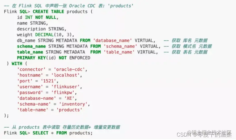 Oracle CDC 连接器已经将底层的 CDC 细节屏蔽,整个实时同步链路,用户只需要几行 Flink SQL,不用开发任何 Java 代码,就可以将 Oracle 的数据变更实时捕获并发送。