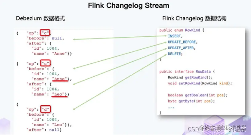 (1)每条 RowData 都有一个元数据 RowKind,包括 4 种类型, 分别是插入 (INSERT)、更新前镜像 (UPDATE_BEFORE)、更新后镜像 (UPDATE_AFTER)、删除 (DELETE),这四种类型和数据库里面的 binlog 概念保持一致。