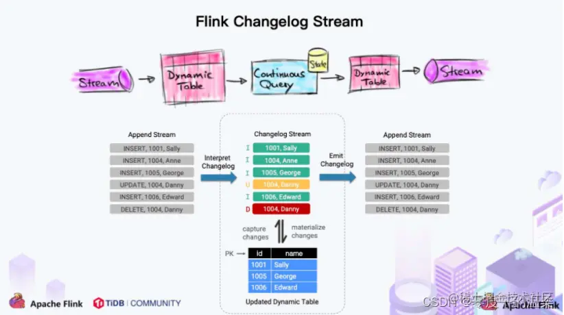 在 Flink SQL 中,数据从一个算子以 Changelog Stream 的形式流向另外一个算子时,任意时刻的 Changelog Stream 可以翻译为一个表,也可以翻译为一个流。