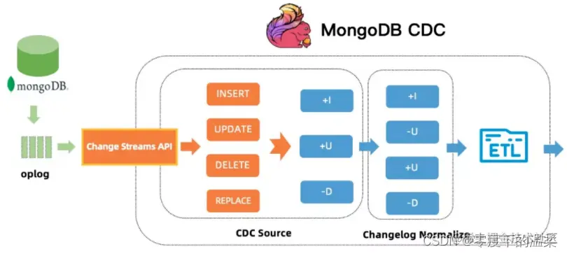 mongoDB CDC 连接器并不依赖 Debezium,是在 Flink CDC 项目里独立开发。MongoDB CDC 连接器支持捕获并记录 MongoDB 数据库中实时变更数据,其原理是伪装一个 MongoDB 集群里副本,利用 MongoDB 集群的高可用机制,该副本可以从 master 节点获取完整 oplog(operation log) 事件流。Change Streams API 则提供实时订阅这些 oplog 事件流的能力,可以将这些实时的 oplog 事件流推送给订阅的应用程序。