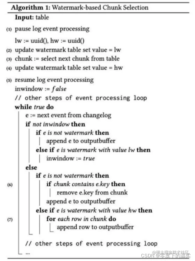 Flink CDC 2.x 结合自身的情况,在 Chunk 读取算法上做了去信号表的改进,不需要额外维护信号表,通过直接读取 binlog 位点替代在 binlog 中做标记的功能,整体的 chunk 读算法描述如下图所示: