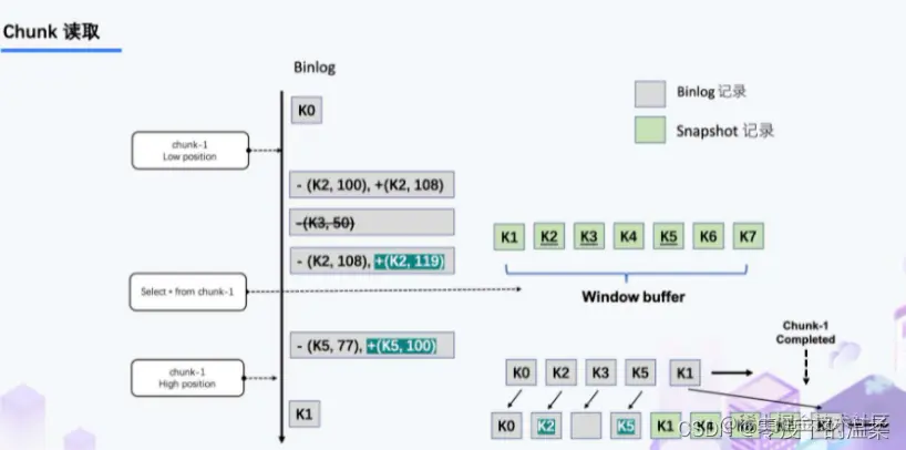 比如正在读取 Chunk-1,Chunk 的区间是 [K1, K10],首先直接将该区间内的数据 select 出来并把它存在 buffer 中,在 select 之前记录 binlog 的一个位点 (低位点),select 完成后记录 binlog 的一个位点 (高位点)。然后开始增量部分,消费从低位点到高位点的 binlog。