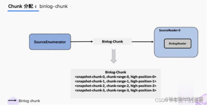 汇报的主要目的是为了后续分发 binlog chunk (如下图)。因为 Flink CDC 支持全量 + 增量同步,所以当所有 Snapshot Chunk 读取完成之后,还需要消费增量的 binlog,这是通过下发一个 binlog chunk 给任意一个 Source Reader 进行单并发读取实现的。
