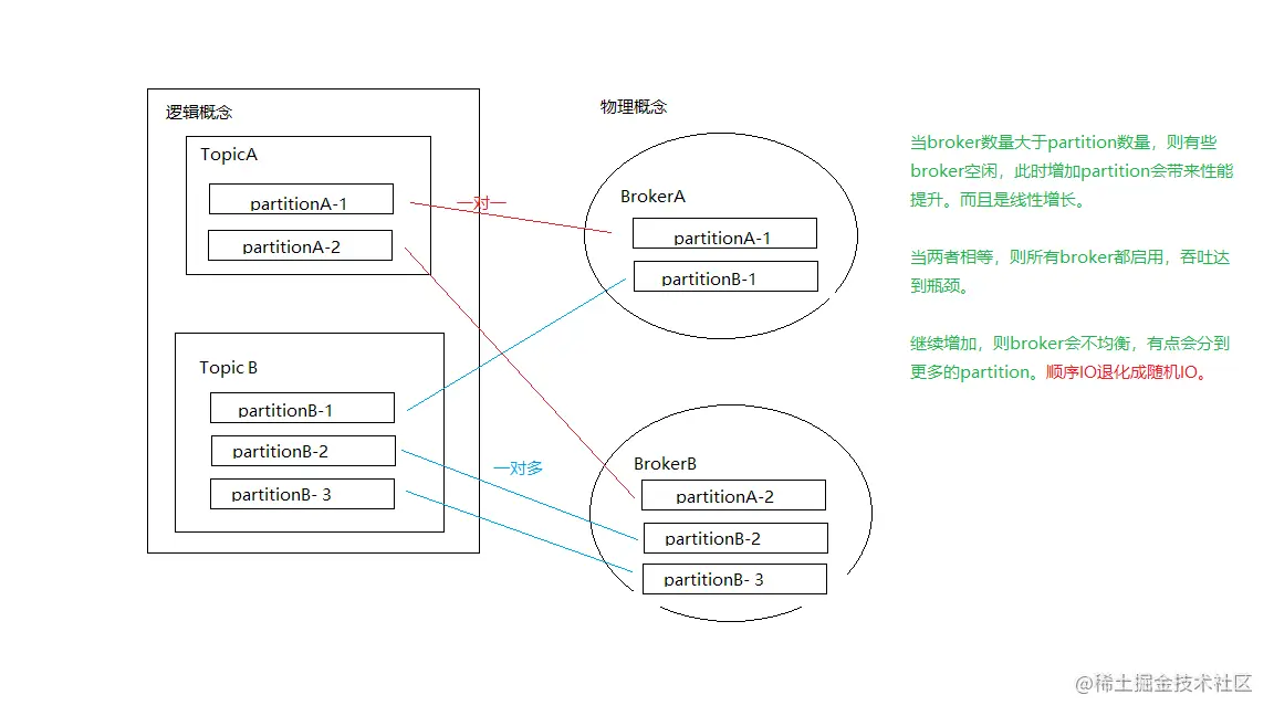 - 当broker数量大于partition数量,则有些broker空闲,此时增加partition会带来性能提升。而且是线性增长。