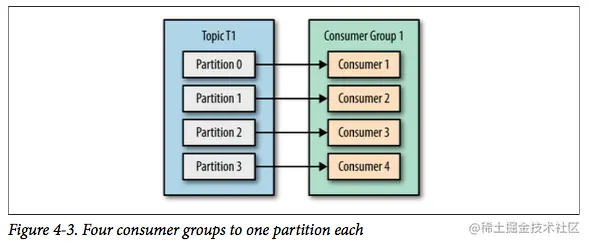 如果增加到 4 个消费者,那么每个消费者将会分别收到一个分区的消息。 这时候每个消费者都处理其中一个分区,满负载运行。