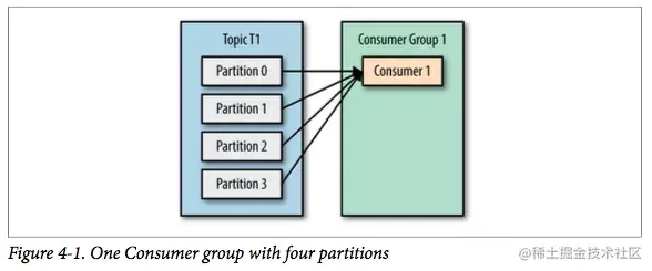 假设有一个 T1 主题,该主题有 4 个分区;同时我们有一个消费组 G1,这个消费组只有一个消费者 C1。 那么消费者 C1 将会收到这 4 个分区的消息。