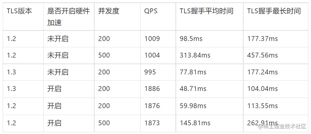 1C2G 情况下,**开启硬件加速后极限 QPS 提高 80% 以上,TLS 握手时间降低一倍。**注:采用 1C2G 规格是因为更容易观察单核极限性能。