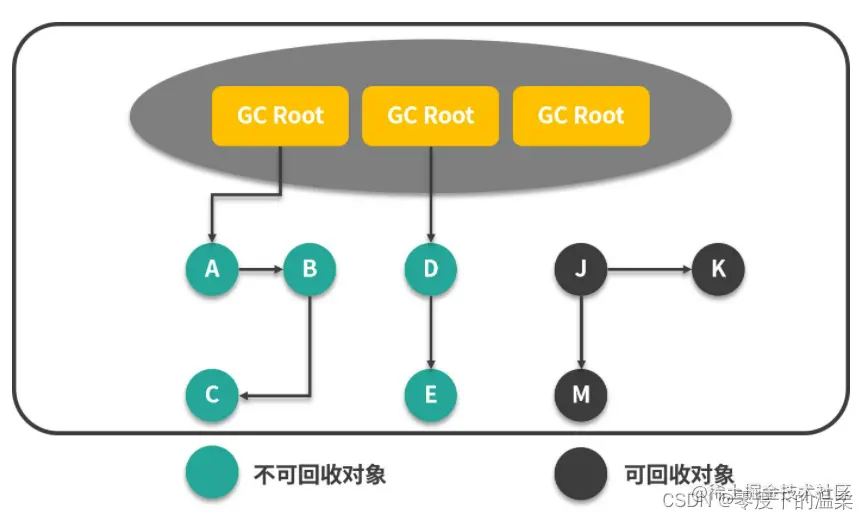 可达性分析算法是通过一系列 GC Roots 根节点集作为起始节点,从这些节点根据引用关系向下搜索,搜索过程中经过的路径称为引用链。如果一个对象到 GC Roots 之间没有任何引用链,那么这个对象就称为不可达,就可以被回收。主流 JVM 采用的就是这种方式。