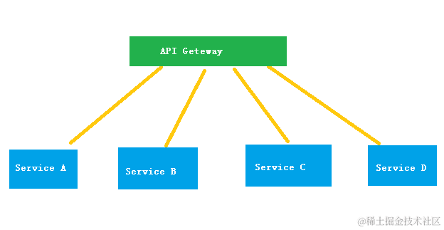 上面:service A、B、C、D 分别是业务组件,通过API Geteway进行业务访问。
