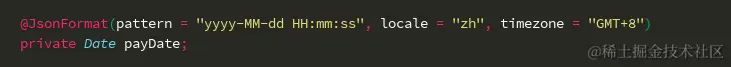 @JsonFormat(pattern = "yyyy-MM-dd HH:mm:ss", locale = "zh", timezone = "GMT+8")