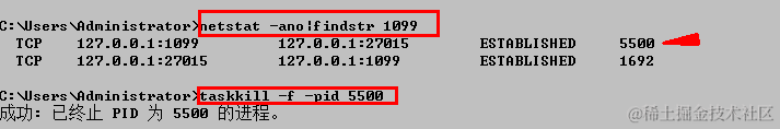 windows系统中端口被占用的解决办法 Hanson 2022-02-23 89 阅读1分钟 在windows下启动程序总报端口被占用,我们可以用下面命令结束 1.查找端口对应的pid 命令:netstat -ano|findstr 1099 2. 结束对应 的pid命令: **** taskkill -f -pid 5500 3.这样就大功告成了