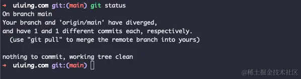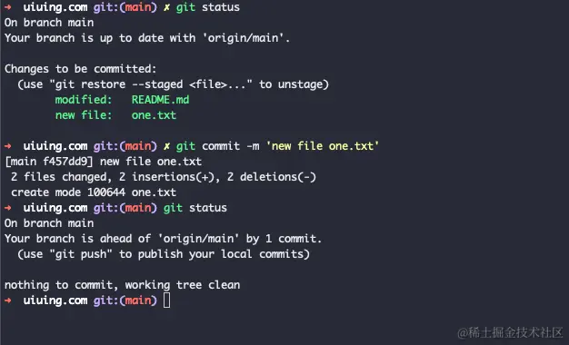 第一行,开头的星号表示当前所在分支,绿色的 main 是分支名,之所以是绿色,也是因为它是当前所在分支。后面第二项是版本号,第三项中括号里面蓝色的字,表示此分支跟踪的远程分支的名字,当然啦,这也是克隆远程仓库到本地时的默认设置 – 创建 main 分支并自动跟踪远程同名分支;冒号后面黑色文字表示本地分支领先其跟踪的远程分支一个提交。最后一项是提交时填写的备注信息。
