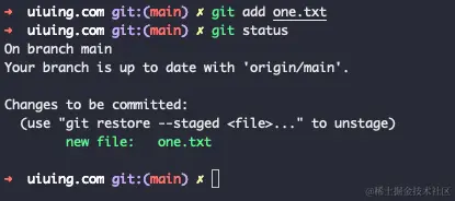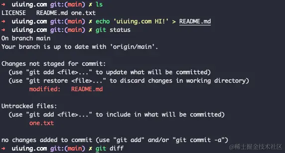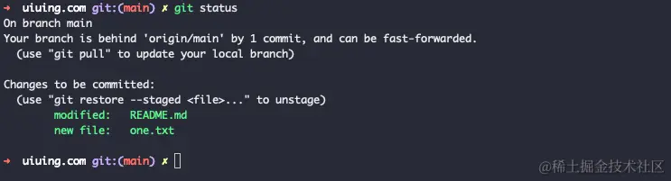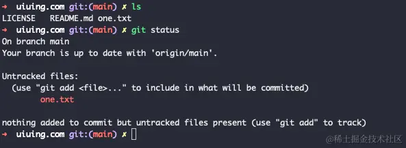 如上图所示,新建文件后,命令行前缀又发生了一些微小的变化,红色 main 后面出现了 * 星号,这表示工作区或暂存区有变化,对文件进行增删改操作都会出现这个星号,另外使用 git status 命令亦可查看详情。