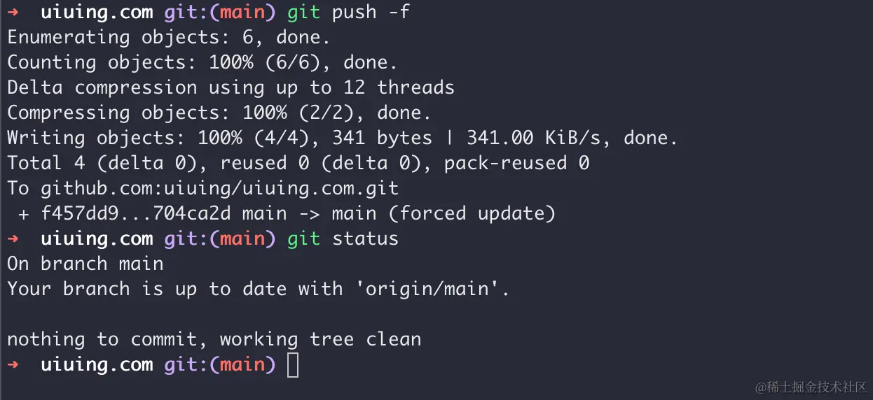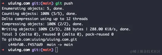 最后一个环节,将本地新增的提交推送到 GitHub 远程仓库中,命令是 git push,后面不需要任何选项和参数,此命令会把本地仓库 main 分支上的新增提交推送到远程仓库的同名分支上,因为当前所在的分支就是 main,而且上文提到,它已经跟踪了远程仓库的同名分支: