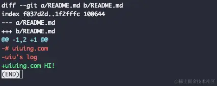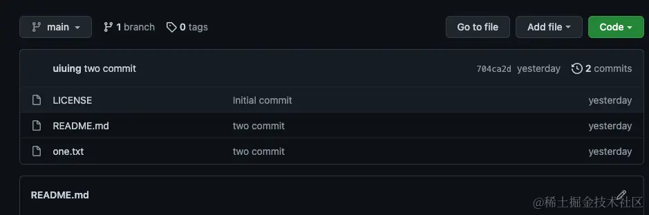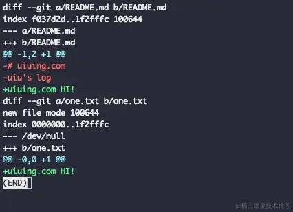 现在介绍另一个命令 git diff,它可以用来查看工作区被跟踪的文件的修改详情,此时新建文件 one.txt 并未被跟踪,而已被跟踪的文件 README.md 无修改,所以看不到。注意,只有在版本区中存在的文件才是被跟踪文件。