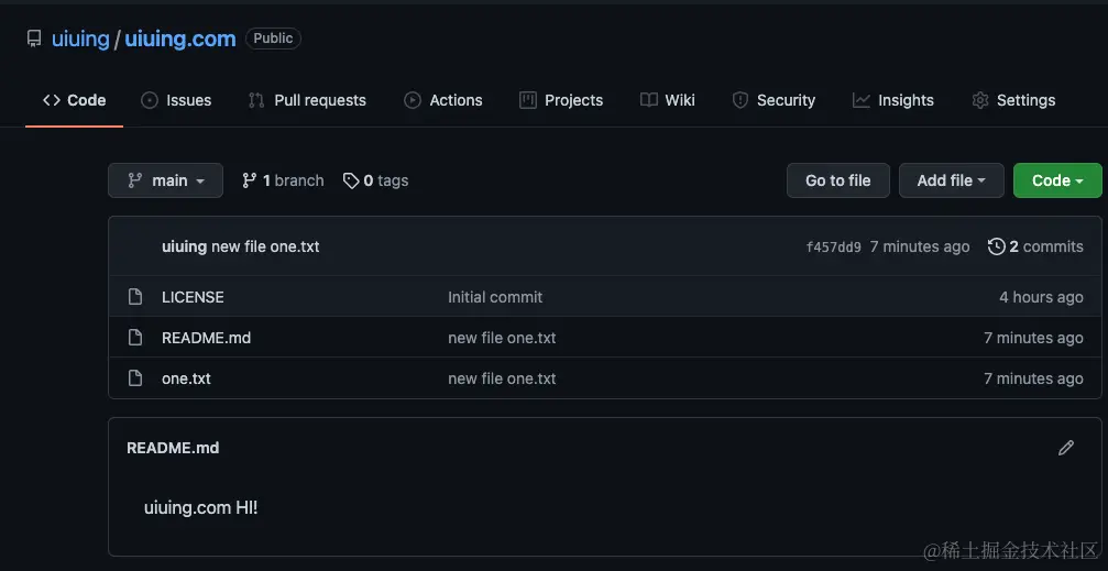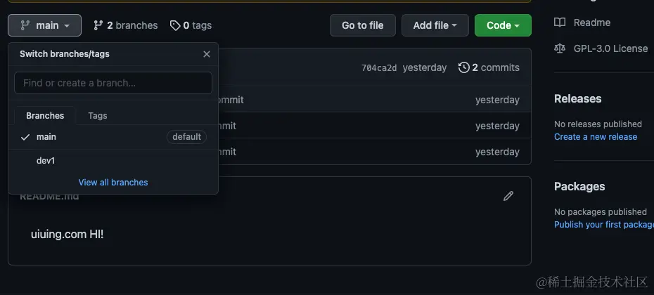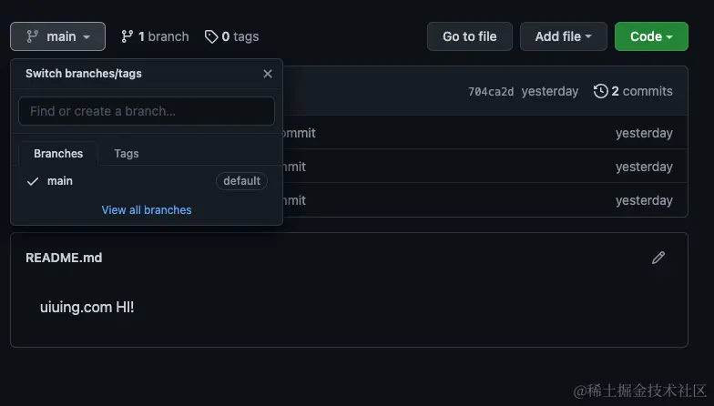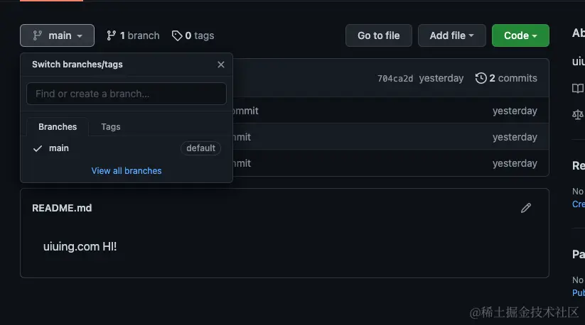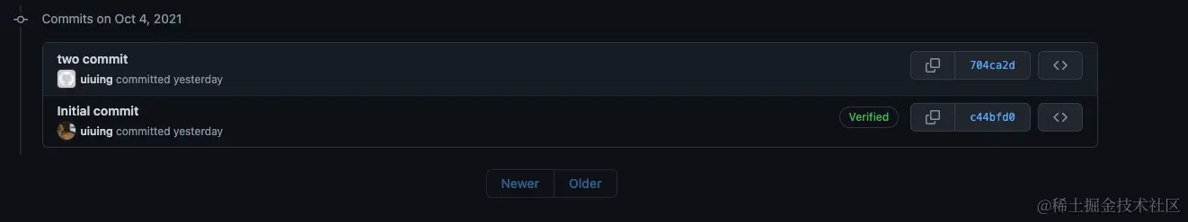 如上图所示,本地分支 main 与远程分支 origin/main 的版本号一致,通常看两个版本号是否一致,只需比对前四位。看一下网页上的情况: