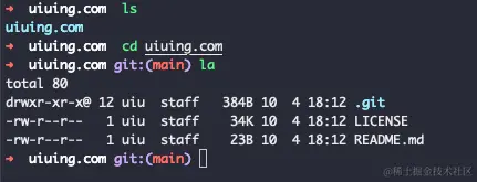 进入仓库主目录,如下图所示,仓库主目录中有个 .git 隐藏目录,它里面包含了仓库的全部信息,删掉这个目录,仓库就变成普通的目录了。进入到仓库目录中,命令行前缀发生了一些变化,出现了红色的 main ,它就是当前所在的分支名: