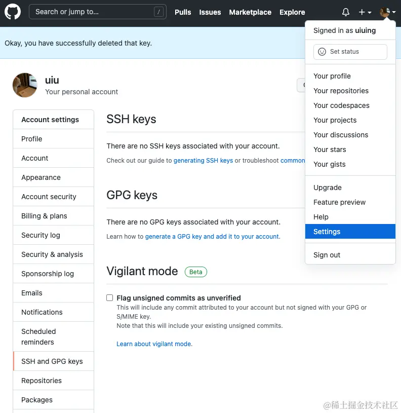 在 2021 年 8 月 GitHub 更新后,已经不再允许使用账户密码操作 GitHub,必须使用 SSH 密钥登陆。所以我们可以在系统中创建 SSH 公私钥,并将公钥放到 GitHub 指定位置。如此操作即可生成 GitHub 账户对于当前系统中的 Git 授权。