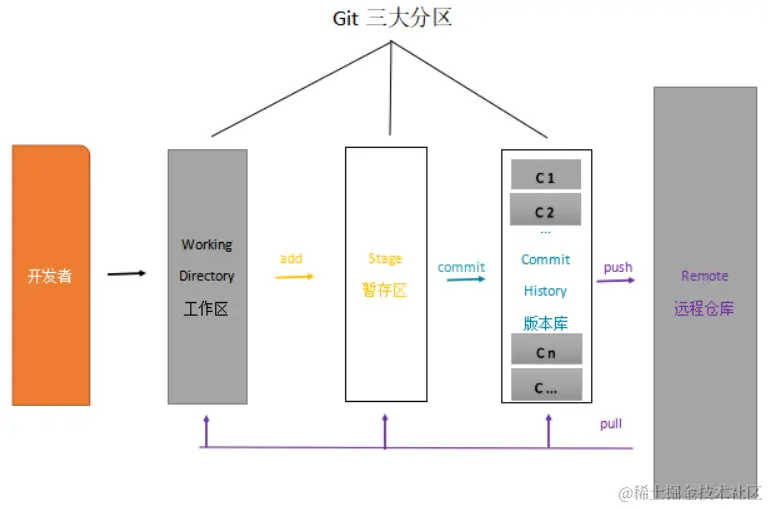 这是一个概念,有这个了解即可,随着使用 Git 的时间增多,慢慢就会理解这三个区域的作用以及为何要这么设计,学习阶段只需按照文档逐步操作即可。接下来我们以命令为主线介绍 Git 的操作。
