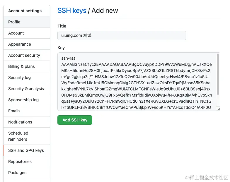 Title 自定义,把剪切板中的内容粘贴到 Key 中,点击绿色按钮添加 SSH Key 即可: