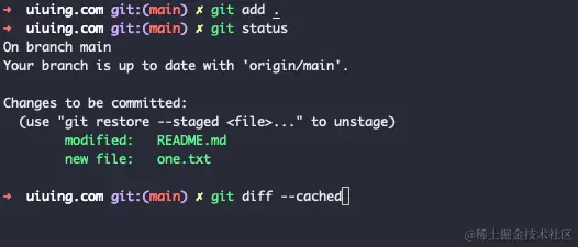 现在,将工作区的两处修改(新增文件 one.txt,修改文件 README.md)全部添加到暂存区,并使用 git diff --cached 查看暂存区的全部修改: