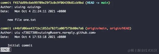 在此之前,先介绍另一个命令 git log,它用来查看版本区的提交历史记录,当前只有一个提交,就是在 GitHub 上创建新仓库时的初始化提交。同样此命令也会跳到新页面,如下图所示: