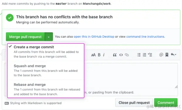 Create a merge commit :这种方式会在组长仓库的 master 分支上生成一个新的提交,且保留 PR 中的所有提交信息。这是一种常规操作,用得最多。