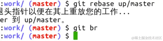 如何同步主仓库哩?方法有二,一是执行 git pull --rebase up master ,此命令需联网,二是执行 git rebase up/master,此命令不联网,因为前面已经执行了 git fetch up 这个需要联网的命令,本地已经有了最新的主仓库 master 分支信息,所以可以这么操作。