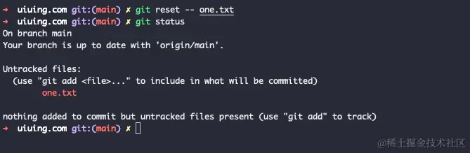 如果要撤销暂存区的修改怎么办?根据上图的提示,执行 git reset -- [文件名] 或者 git rm --cached [文件名] 命令即可:
