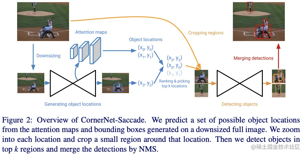 CornerNet-Saccade在可能出现目标的位置的小区域内进行目标检测,首先通过缩小的完整图片预测attention特征图,获得初步的预测框位置以及尺寸,然后在高分辨率图片上截取以该位置为中心的图片区域进行目标检测。