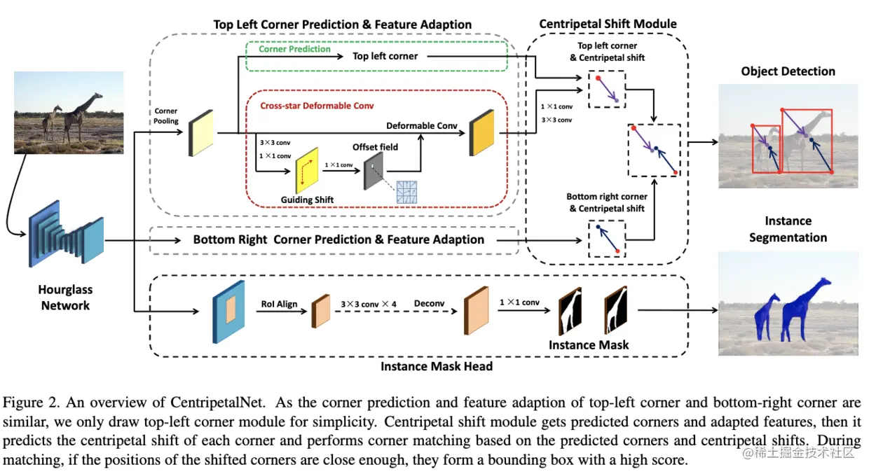CentripetalNet的核心在于提出了新的角点匹配方式,额外学习一个向心偏移值,偏移后足够近的角点即为匹配。如图2所示,CentripetalNet包含四个模块,分别为: