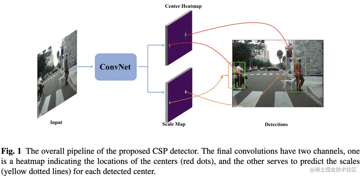 CSP的网络结构大致如图1所示,在主干网络上分别预测目标中心点的位置及其对应的尺寸。这篇文章的整体思想与CenterNet(zhou. etc)基本一致,但不是抄袭,因为是同一个会议上的论文,CenterNet主要研究常规的目标检测,而这篇主要研究人脸检测和行人检测。但CSP仍然需要进行NMS的后处理,较CenterNet更逊色一些,但不妨碍我们进行简单地了解,包括学习论文的训练方法以及参数。
