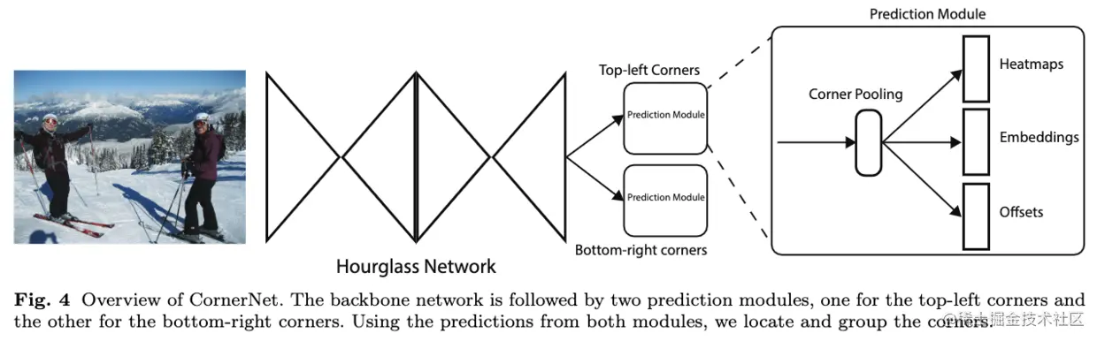 CornerNet的结构如图4所示,使用hourglass网络作为主干网络,通过独立的两个预测模块输出两组结果,分别对应左上角点和右下角点,每个预测模块通过corner池化输出用于最终预测的热图、embedding向量和偏移。