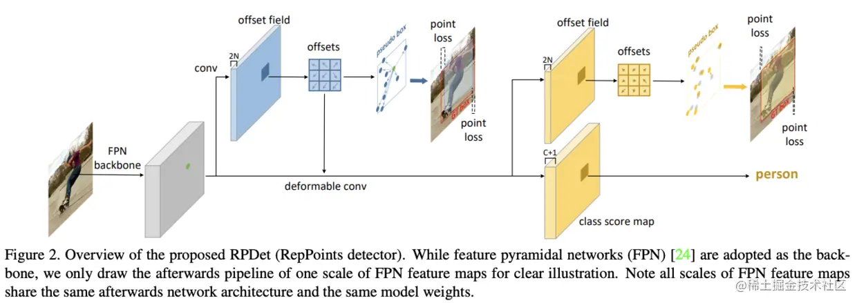 RepPoints是一个点集,能够自适应地包围目标并且包含局部区域的语义特征。论文基于RepPoints设计了anchor-free目标检测算法RPDet,包含两个识别阶段。因为可变形卷积可采样多个不规则分布的点进行卷积输出,所以可变形卷积十分适合RepPoints场景,能够根据识别结果的反馈进行采样点的引导。