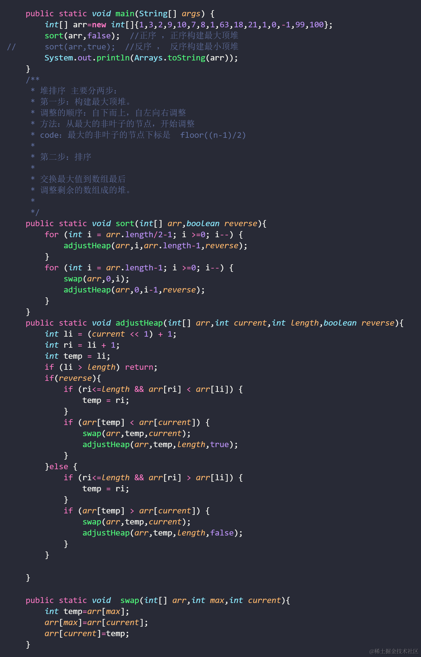 - 3:由于交换后新的堆顶 R[1]可能违反堆的性质,因此需要对当前无序区(R1,R2,……Rn-1)调整为新堆,然后再次将 R[1]与无序区最后一个元素交换,得到新的无序区(R1,R2….Rn-2)和新的有序区(Rn-1,Rn)。不断重复此过程直到有序区的元素个数为 n-1,则整个排序过程完成